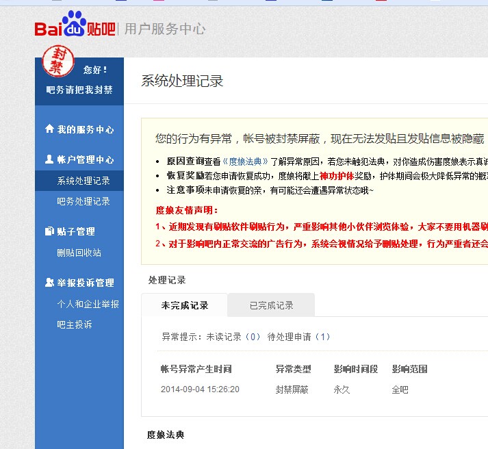 亲~~你反馈的帐号被封禁是由于大量刷帖,这是非常恶劣的违规行为~度娘要维护贴吧的良好秩序,所以不能给你反馈的帐号解封~~。希望小伙伴能好好学习下《度娘法典》,改正错误之后,可以前往贴吧账号管理中心自行恢复账号状态哟~https://tieba.baidu.com/pmc/main账号异常解除方式及处理时间:1、自助解除:手机解除立即生效。(PS:账号绑定手机号后会下发手机验证码,通过即可解封。)2、人工申诉:工作时间最快4小时处理。★温馨小提示:请尽量避免发布垃圾广告贴、水贴等,以保证广大吧友在贴吧的良好浏览体验。
