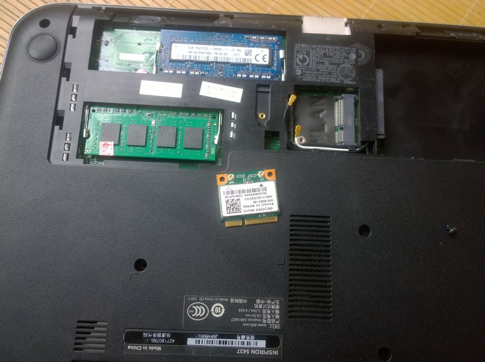 本子是14r 5437 图中为2根内存一个无线网卡 带蓝牙哦 蓝色那根是自带的现代4g单条 绿色的是自己后来加的 淘宝360买的三星8g单条(估计不是正品) 用了也算1年了