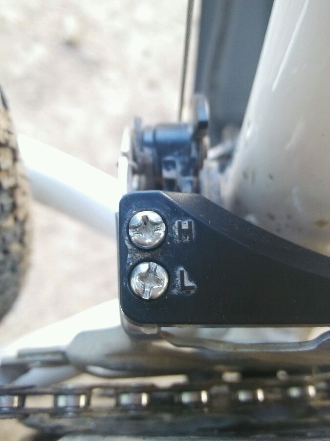 限位知道吗?就是最高与最低,太低了链条就会掉出去不在牙盘,掉链子。太高同理。有个合理范围值,自己调教吧。不要超出牙盘范围,不蹭链条就行了。说不清楚,我自己都说乱了。自己动手吧