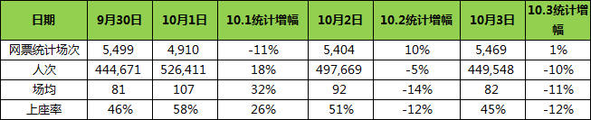 一、仅以网票显示数据作为统计基数;(含9月30日、10月1日、10月2日、10月3日对比)