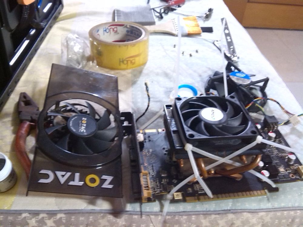 AMD的这款原装散热用在显卡上有优点和2个缺点:优点是4热管铜底和铝散热片非常密集,做到了导热和热容量很好的结合。缺点也很明显,重量相对于显卡散热器来说太大了,如果没有加固条显卡弯曲是分分钟的事;另一个缺点就是铝散热片太密集了,需要高风压的风扇才能达到良好的散热效果,另外最要命的是散热片太密集非常容易结垢(自己就在用几个这样的散热器,没几个月就结满满的一层灰垢,清理后CPU温度可以暴降10度),所以你必须要经常清理散热片缝隙。