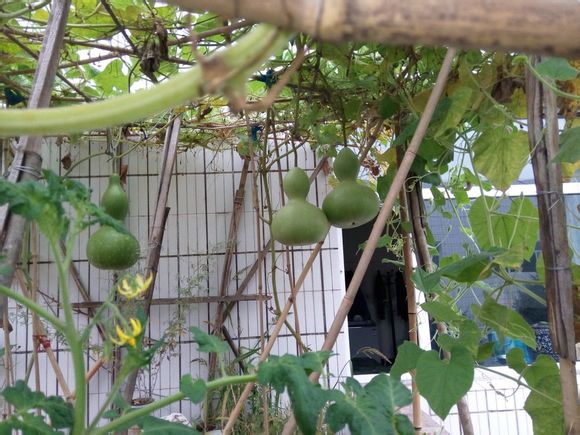 二楼露台的小花池里种了两棵葫芦
