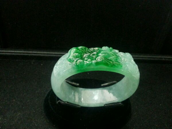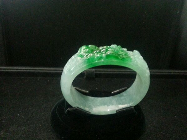 这个手镯比较有特色,绿的到位,上面雕荷花,寓意百年好和。整个手镯是老坑冰种,质地均匀,通透水足。