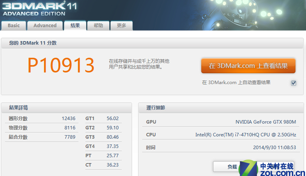 微星980M版的GT72测试已出,4710HQ+980M的3DMark11测试结果