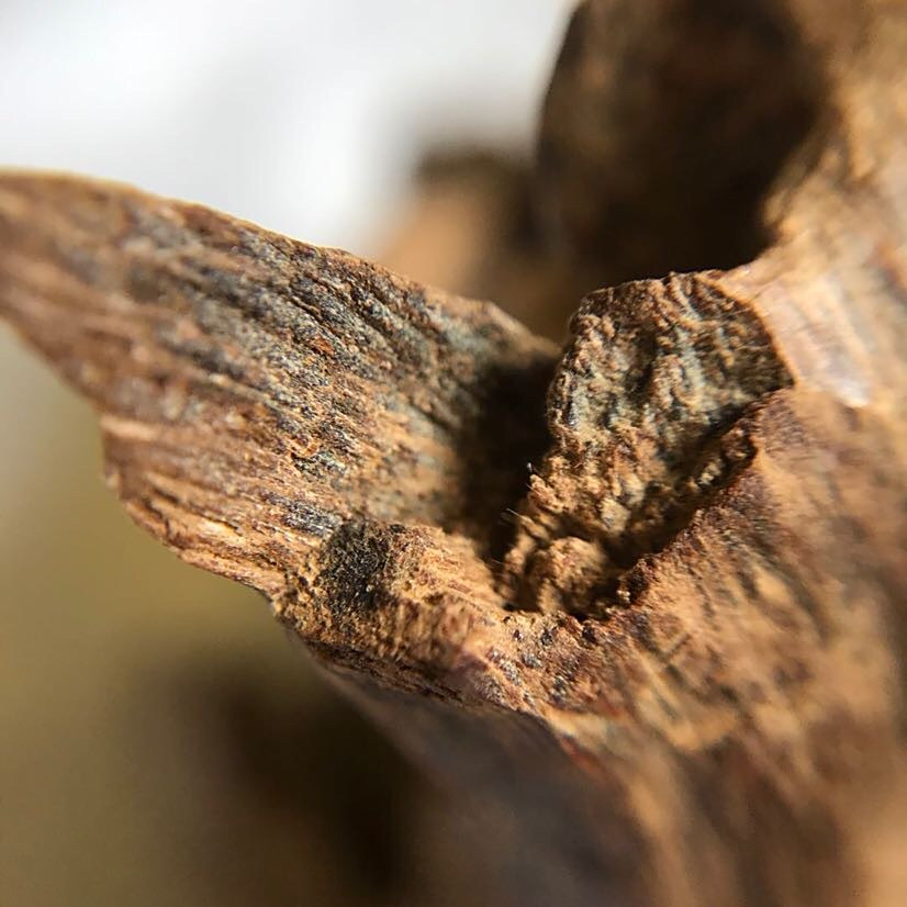 就是想跟大家探讨探寻下这块香的结香方式。首先肯定是野生生结,类似包头,那就是说可能是树干断了或其他原因受伤,结香,然后香把受伤部位包裹起来成了这样的蘑菇形状。但这块蘑菇又不像包头那么硬,反倒有点熟的感觉。可能就是形成类似包头的结香后,树就倒了,埋在土里,有一定土熟的特征。请各位大神指正如上猜测。谢谢!
