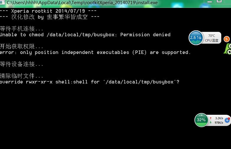 2.先使用RootkitXperia一键ROOT系统(直至显示“按任意键退出”),再安装recovery。