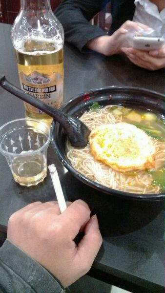一碗粉,一瓶啤酒,一支烟。简简单单的生活
