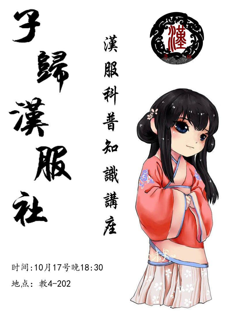 衢州学院子归汉服社社员见面会暨“汉服科普知识讲座”将于10月17日(本周五)晚18:30,在教学楼4幢202室举行,届时欢迎新人及广大汉服爱好者前来,期待大家的踊跃参与。