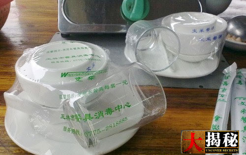 用塑料薄膜包裹的消毒餐具,内有盘子、碗、醋碟、勺子、杯子,外加一双筷子。当它们放到你面前时,看起来很干净,包装膜上还印有“卫餐消证号”、生产日期和厂家等信息,看似很正规。但有时你会发现,戳破那层膜,部分消毒餐具会有污迹、饭菜渣或水迹等。