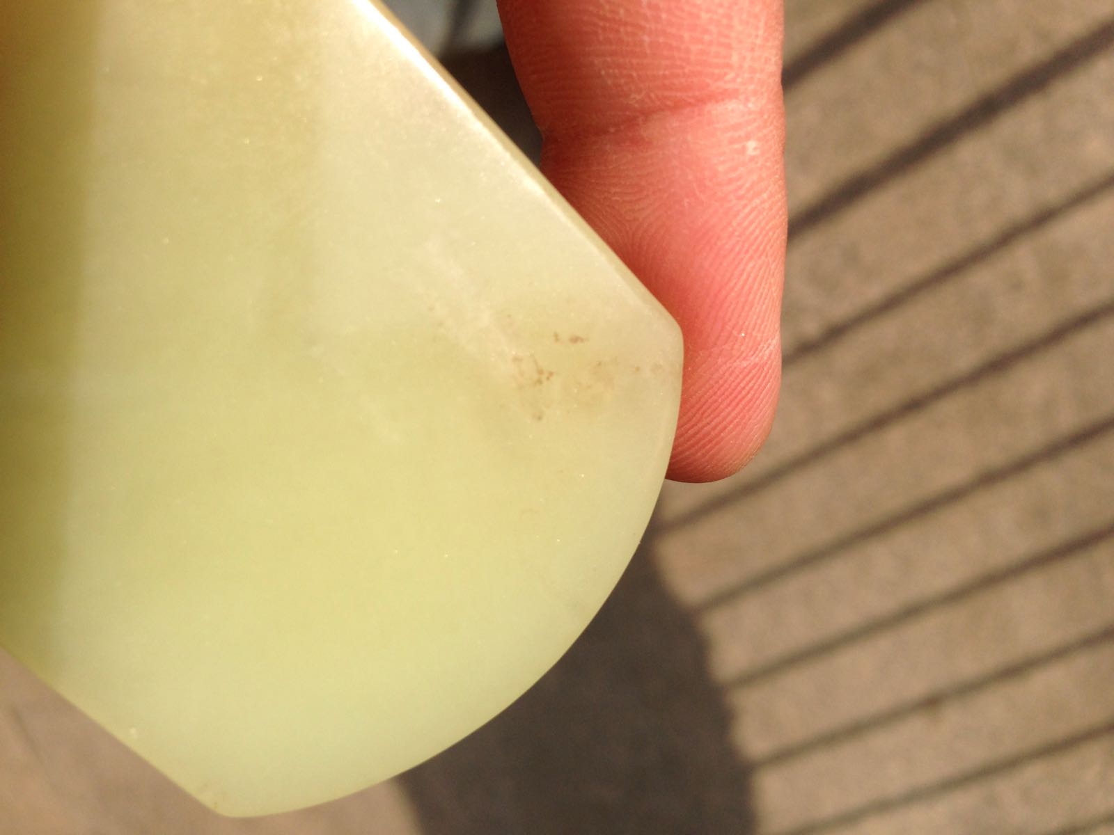 和田玉的白黄口,应该略显黄绿,较透,不像且末料,你这块是新收的吧,像俄新矿料,这块料子稀松了些,机工,价值不高
