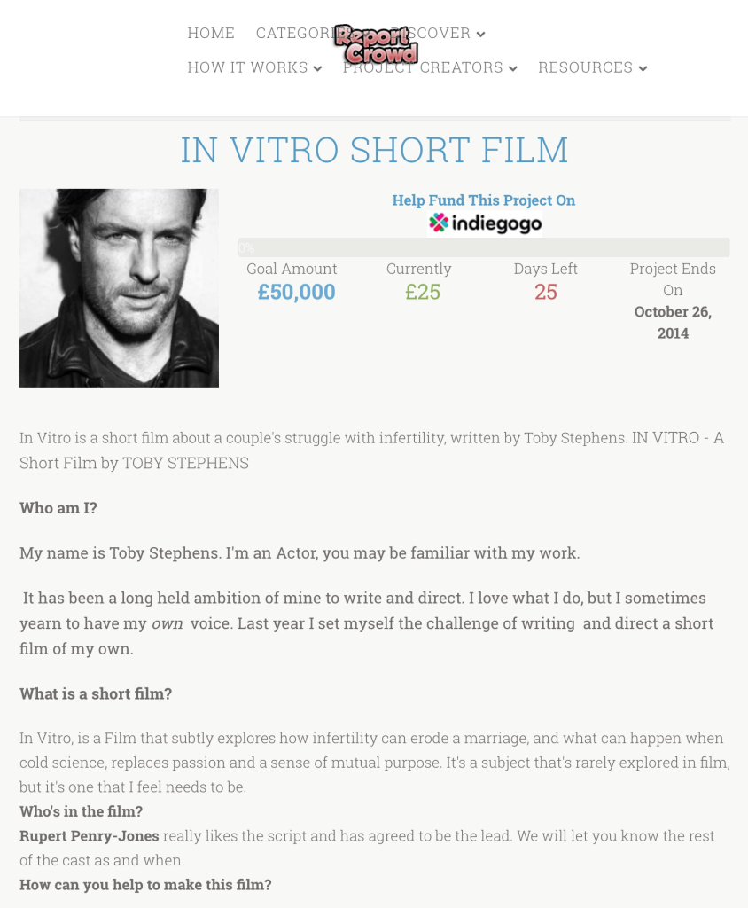 大概在不到一年以前,Toby在一次访谈中曾提到过他有写一个短片的剧本,当时就我个人来讲没太觉得他会非常认真对待这件事情。不过看起来他对自己的这次创作确实很认真很投入,因为他正在努力把这个剧本变成实实在在的片子。剧本名字叫In Vitro,讲述的是一对夫妻由于不能生育而对婚姻造成的破坏。初看内容个人觉得蛮囧的,据Toby自己解释说是因为身边有朋友有这样的问题,而他自己为人父以后也会关注这类问题,同时他觉得涉及这方面的作品挺少的,因此有了创作这样一个短片的想法。据他自己介绍说,好友RPJ已经同意出演片中的男主,其他的演员还待定。这部短片采用向粉丝募集拍摄资金的方式,感兴趣的粉丝可以在某网站上捐助资金。Toby为了这次短片还特意开通了推特和脸书的帐号与粉丝互动,感兴趣的朋友可以到这两个网站上关注他。说来我个人觉得他开通推特和脸书倒不全是为了新短片的缘故,更象是《黑帆》的片方那边的推动,毕竟《黑帆》的几位主要演员都有推特,只有他没有也不太说得过去。