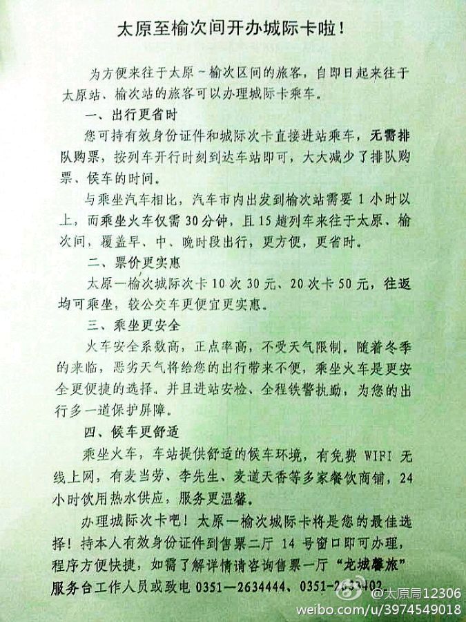 继太原古交月卡后,太原和榆次间又推城际卡,详情咨询12306