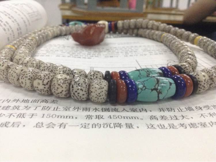 感觉石头玛瑙神马的太沉了,戴着累脖子。于是选了竹质的佛头和顶珠,紫檀的腰珠,橄榄核的隔片隔珠。整条配下来颜色素净,重量轻盈,最重要的一点,没有金属,没有石头,全套都是植物材料。同事说有点儿太素了……发上来请大家给点评一下,是否需要再搭配得再艳丽一些呢?