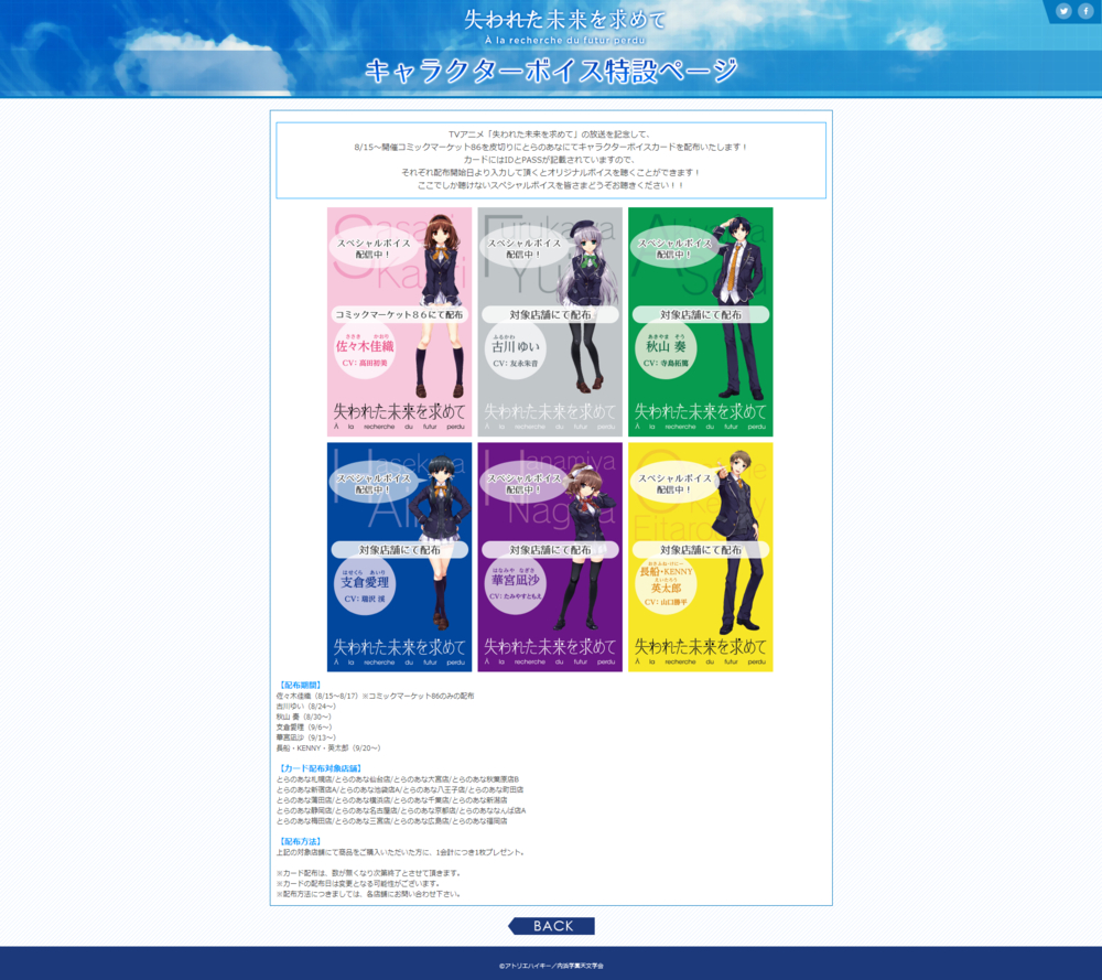 话不多说官网的http://ushinawareta-mirai.com/card/ 页面凭买东西送的卡片上的用户名密码可以听各位主角专有的迷你Drama