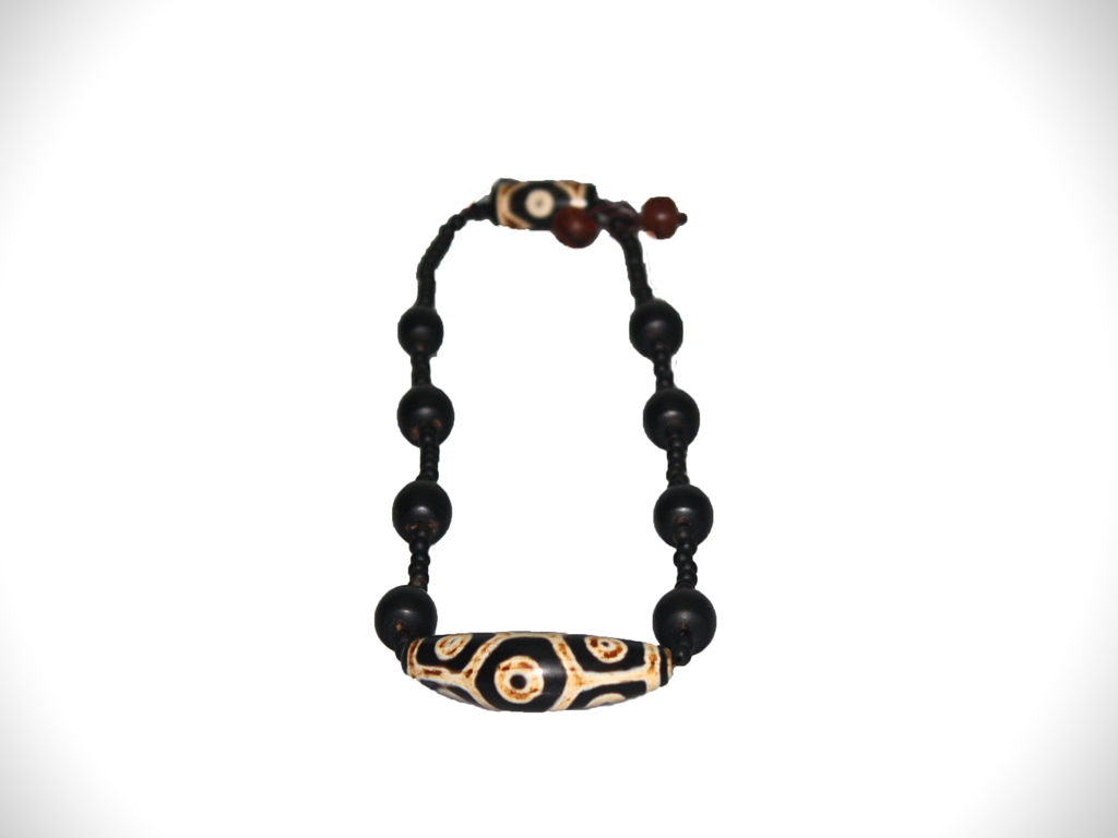 此天珠形体较大,为纯正的黑白两色,九眼,天珠中最上品;且型态为三棱型,极为罕见。曾经多代活佛大德承传供奉,原在其体中凝聚的朱砂般血沁在多次的火贡中变色,使珠体发色出如今的颜色,这是心血功力渗透后的结果。纹路清楚,包浆润泽,并有自然风化和喇嘛炼药凿取磨削过的痕迹。 此三棱九眼藏传老天珠,据传是藏传佛教格鲁派在后藏地区最大的寺院,全国著名六大黄教寺院之一,扎什伦布寺 "四世班禅"加持的佛门圣物,拥有不可思议的神奇力量。唯有福报深厚者,才有缘得此天降圣石