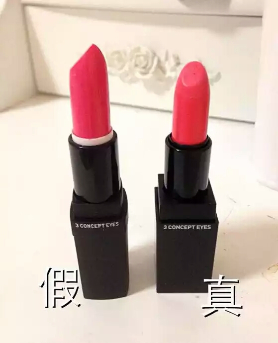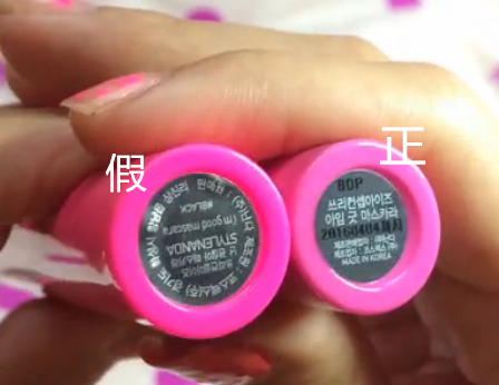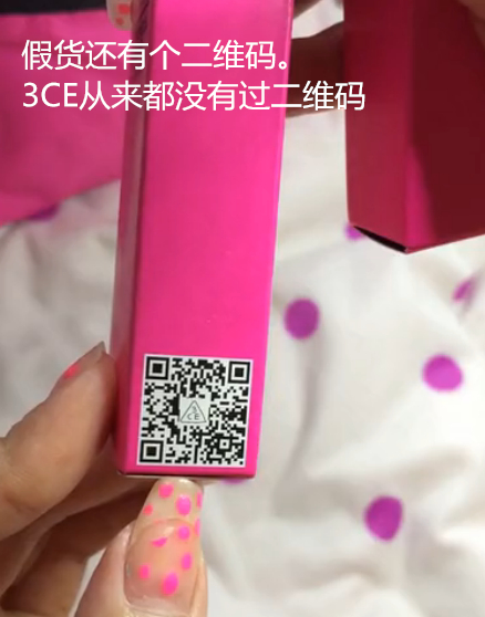 下面是包装盒对比,上面的是假货的包装盒,下面的是真货的包装盒。大家切记3CE从来没有把生产日期印在过包装上