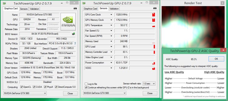 微星GTX 980 Gaming 4G采用NVIDIA GM204核心,拥有2048个流处理器,核心基准频率1216MHz,平均Boost频率1317MHz,采用256bit 4GB的GDDR5显存,显存频率1753MHz。其中核心频率比公版超频90MHz,因此性能也应该比公版稍微提升一些。微星这次采用了TwinFrozr V散热器,其中有一个很大的改进就是在待机时两个风扇都会停转,实现显卡待机零噪音,在GTX 970 Gaming评测中我们已经进行了大部分的介绍。所以在GTX 980 Gaming左侧风扇上,微星特别贴了一张字条告知用户,该散热器运用了ZeroFrozr待机零噪音技术,在待机时风扇不转是正常现象。