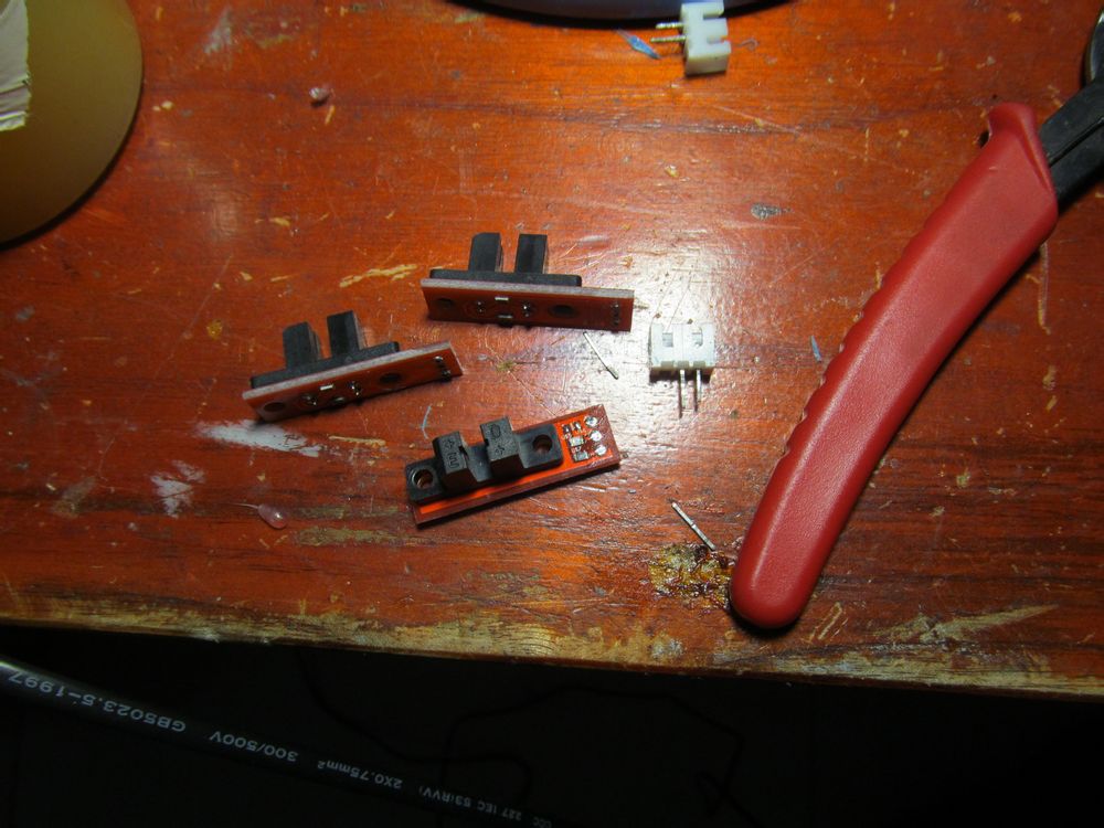 三个限位开头的接插件都已经弄掉了。如图,由于没有吸锡枪,取下有点麻烦,我的懒人做法是电烙铁直接在接插件的引脚上加热,等锡熔掉了,就用烙铁把它们一个个按下去,最后把接插件翅掉,当然这样接插件就作废了。没关系,反正它们已经用不着了。