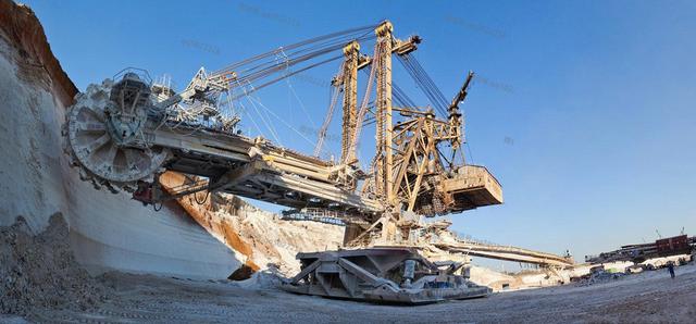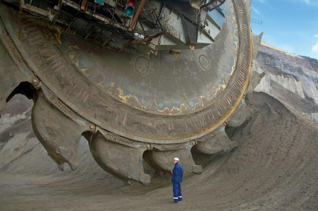 这种勺轮式挖掘机长是足球场的两倍,有30层楼那么高,这个机械一天可以挖24万吨,不是24吨,也不是240吨,是24万吨,后面有个万字。