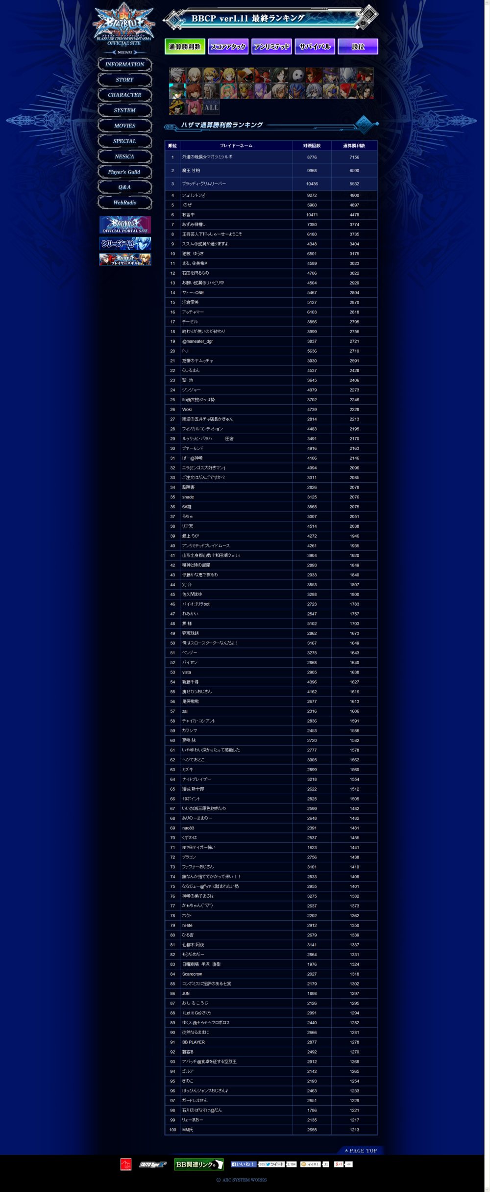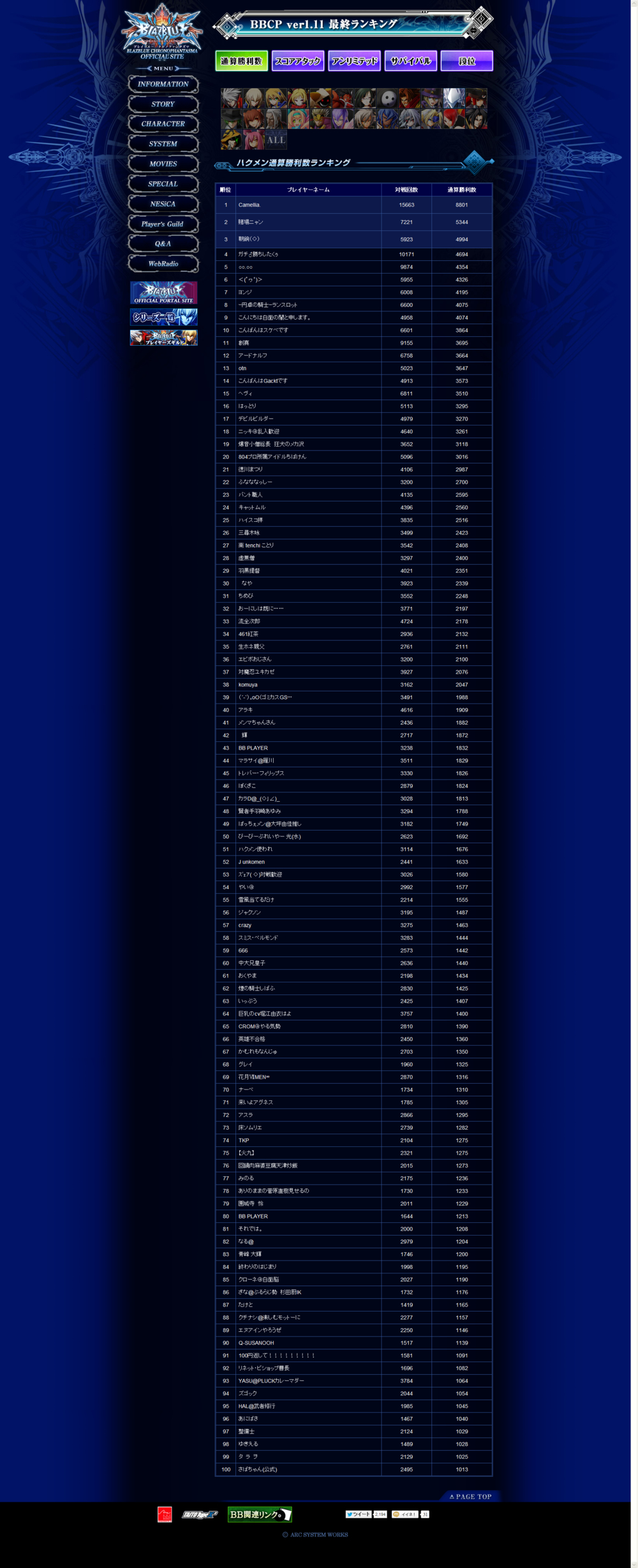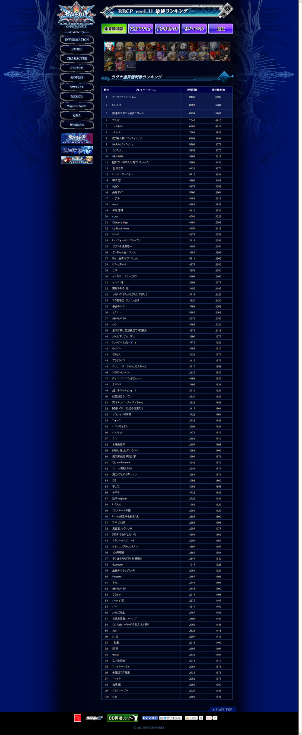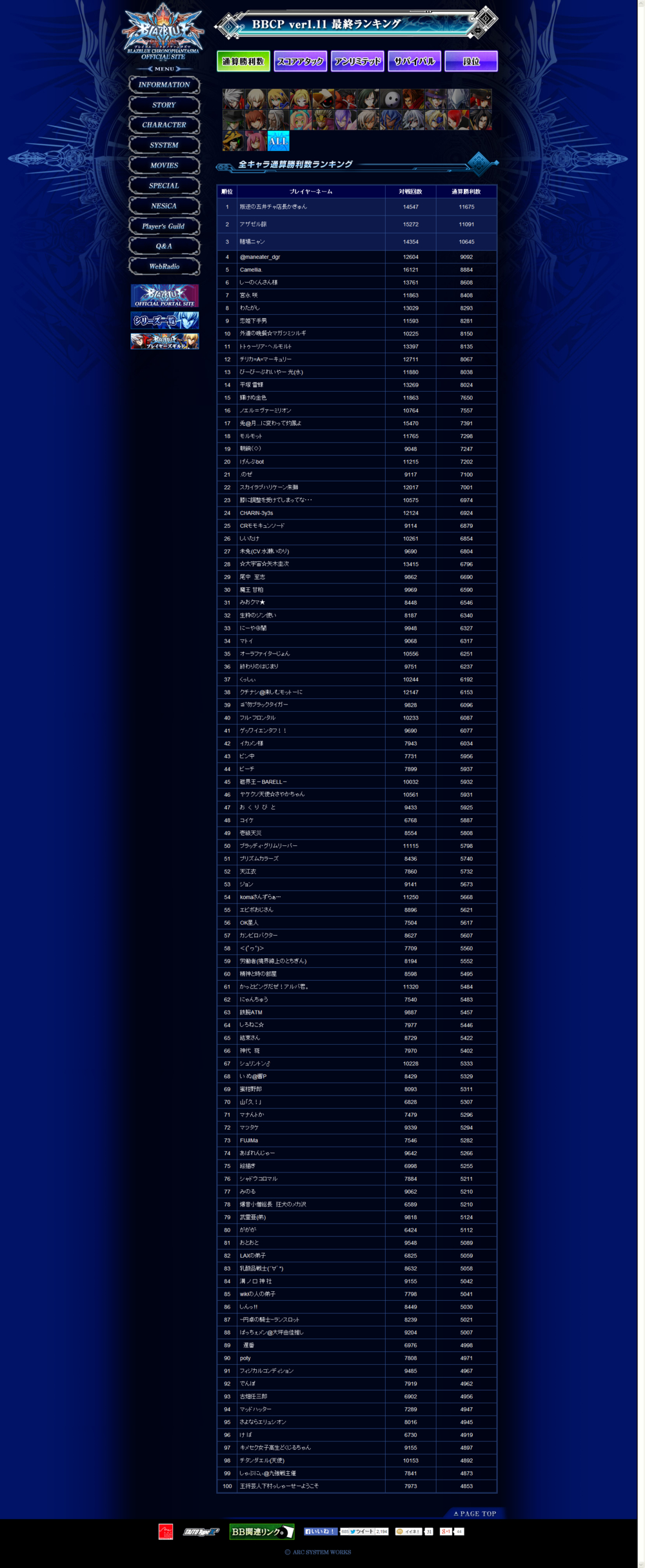 《苍翼默示录 刻之幻影》街机版Ver1.11最终排名情报
