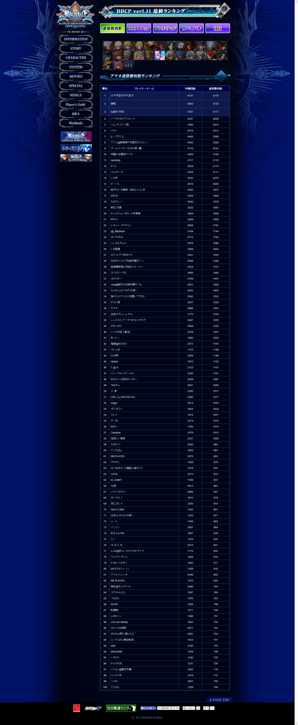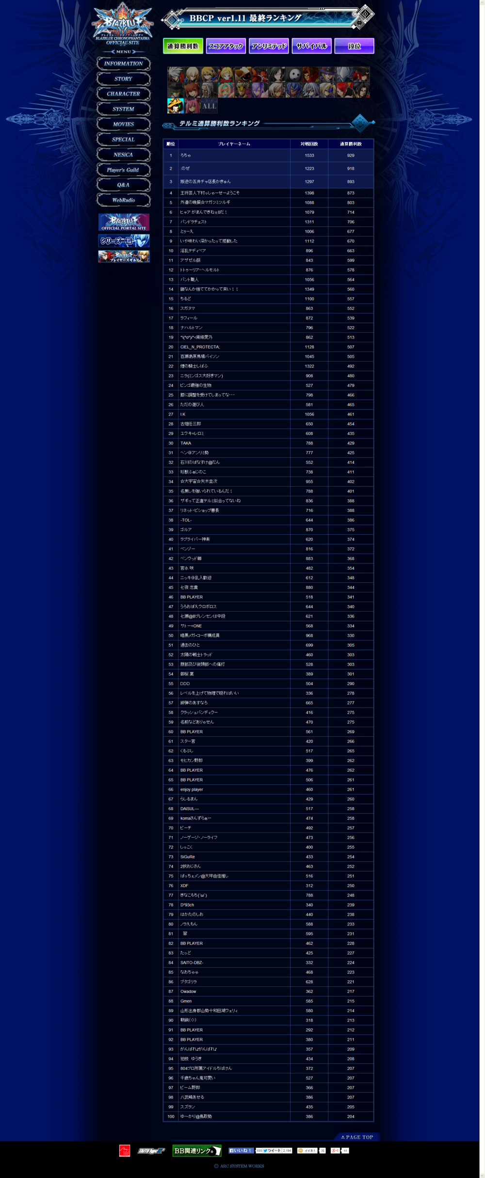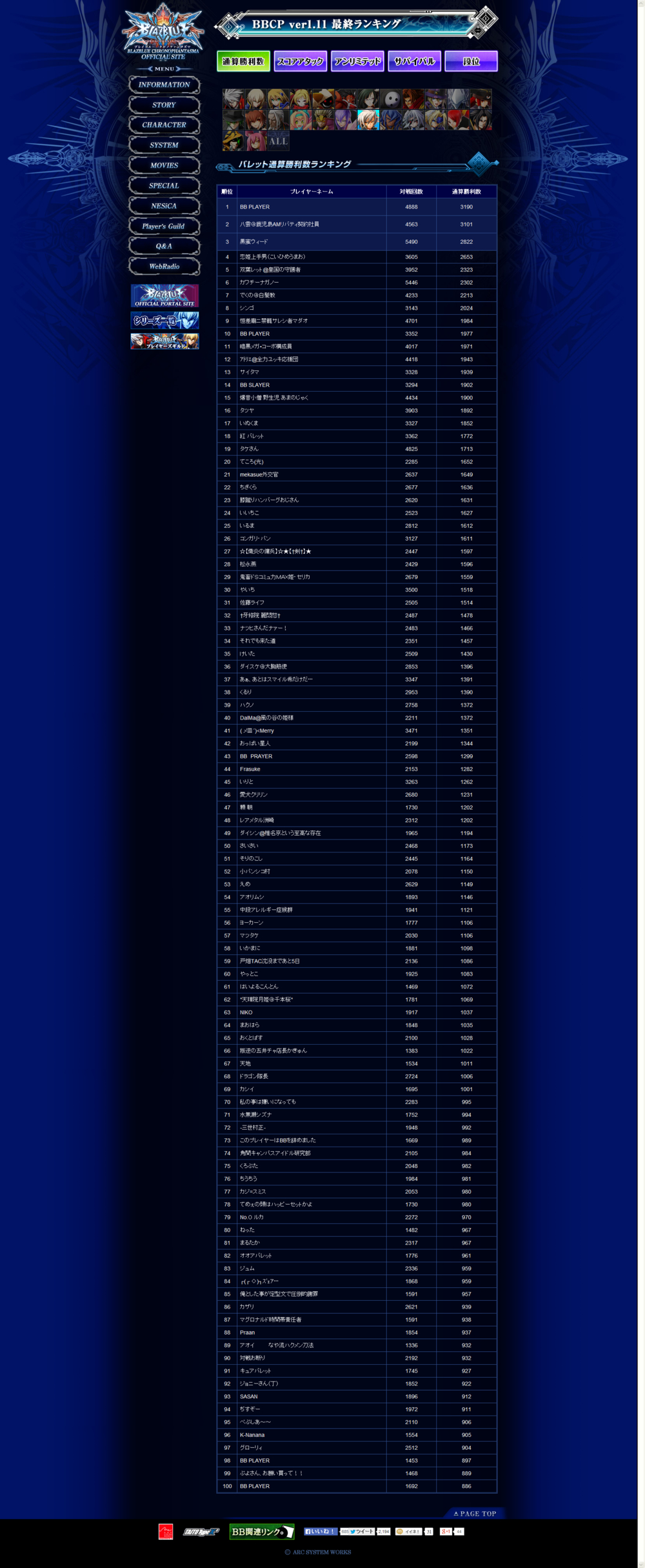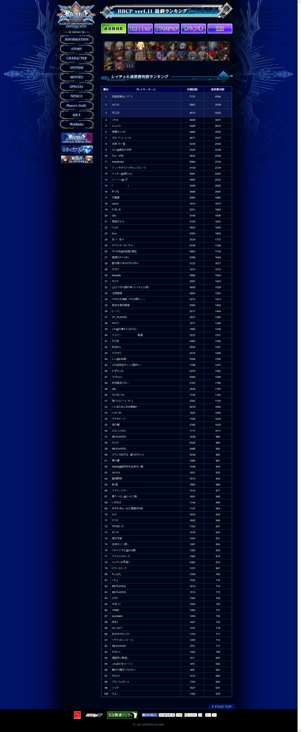 《苍翼默示录 刻之幻影》街机版Ver1.11最终排名情报