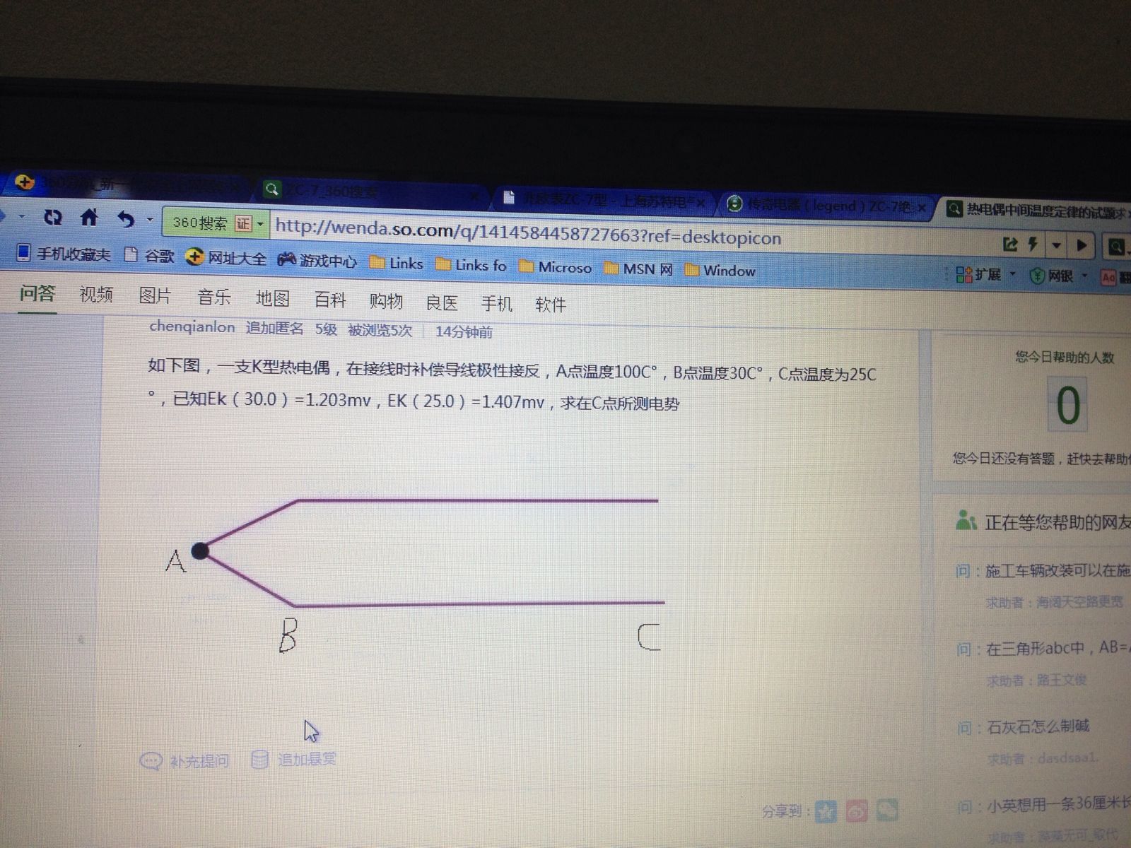 在B点会产生两个30度的电势。另已知条件中少了个100度的电势,或者老师让你们自己背下了特殊点的电势值。