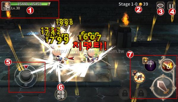 游戏采用目前韩国最常使用的虚拟摇杆设计控制,玩家左手拇指控制人物方向,右手点击技能泡泡施放的进行模式,对於玩家来说是非常容易上手的控制模式。不仅如此,玩家也可按下自动战斗按钮,人物便会自动寻径与攻击怪物,玩家只要轻松施放技能即可,甚至可以花费1500虚拟货币直接使用自动技能施放,对於RPG战斗操作苦手的新手玩家来说是相当贴心的设计。