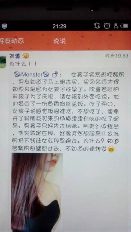 故事大概细情是这样:女孩子A突然想吃酸的、男友B很关心女孩子、以为女孩子只是突然想吃酸的、知道后就立刻去买了、但是买回来后才知道是因为女孩子怀孕了、这时候有个句号、到了下一段话、男孩子C是女孩子A的朋友、关系还很不错、知道了女孩子A怀孕后、便请女孩子A到外面吃饭、各自点了一分鱼香肉丝盖饭、吃了两口、女孩子A说感觉到很难吃、不想吃了、这正是怀孕女子的正常现象、没胃口的表现、她接着撕开了男朋友B买来的杨梅津津有味地吃了起来、男孩子B体贴女孩子A就去结账了、但是刚走到收银台、他突然定在那、想起了自己女友D最近也喜欢吃酸的、不知道是不是自己女友D也怀孕了、于是很惊喜、马上扔下钱往女友D那里跑去、想问女友D是不是也怀孕了、