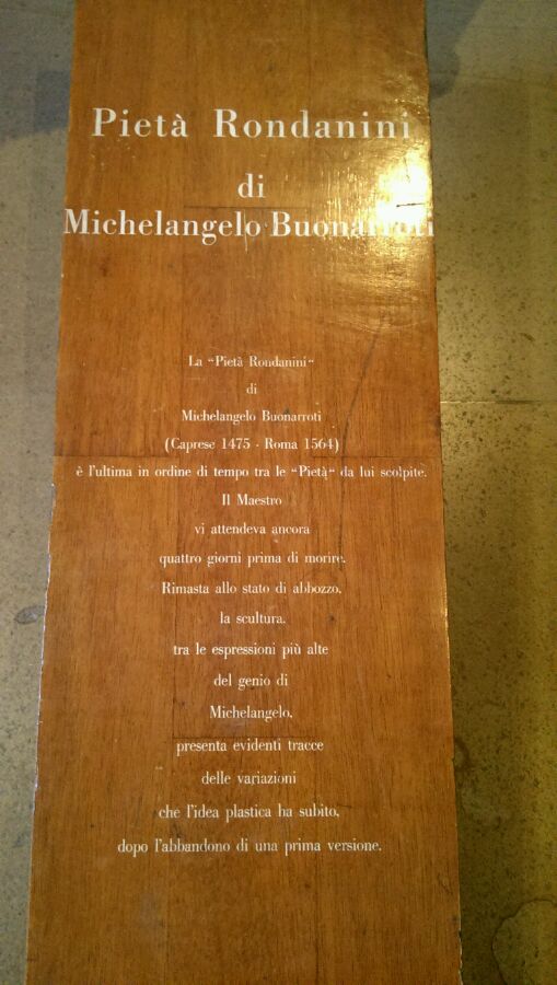 没想到亲眼看到的第一件米氏作品就是他的遗作,当时刚好在逛米兰大教堂,朋友说不远有个古堡,走了一会就到了Castello Sforzesco。在门口就摆着展出Rondanini pietà的大幅海报。进去之后里面很大,被设计为环型的动线。米的圣殇自然被放在最后作为镇堡之作。当时一起去的还有群学生,讲解员详细的讲了米的生平,讲到米年轻时鼻子被打断还配上了一个夸张的动作,我虽然听不大懂意大利语大概能也了解她所说的内容~