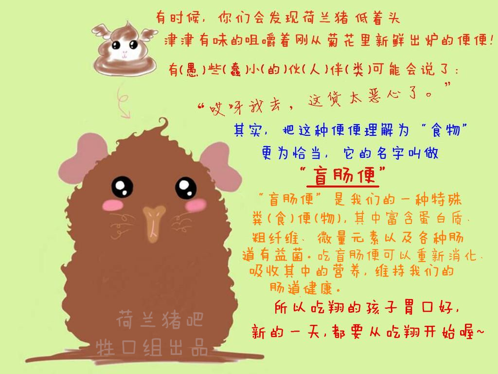 有时候,我们会发现荷兰猪低着头津津有味的咀嚼着刚从肛门里新鲜出炉的便便,有些小伙伴可能会说了:“哎呀我去,这货太恶心了。”。