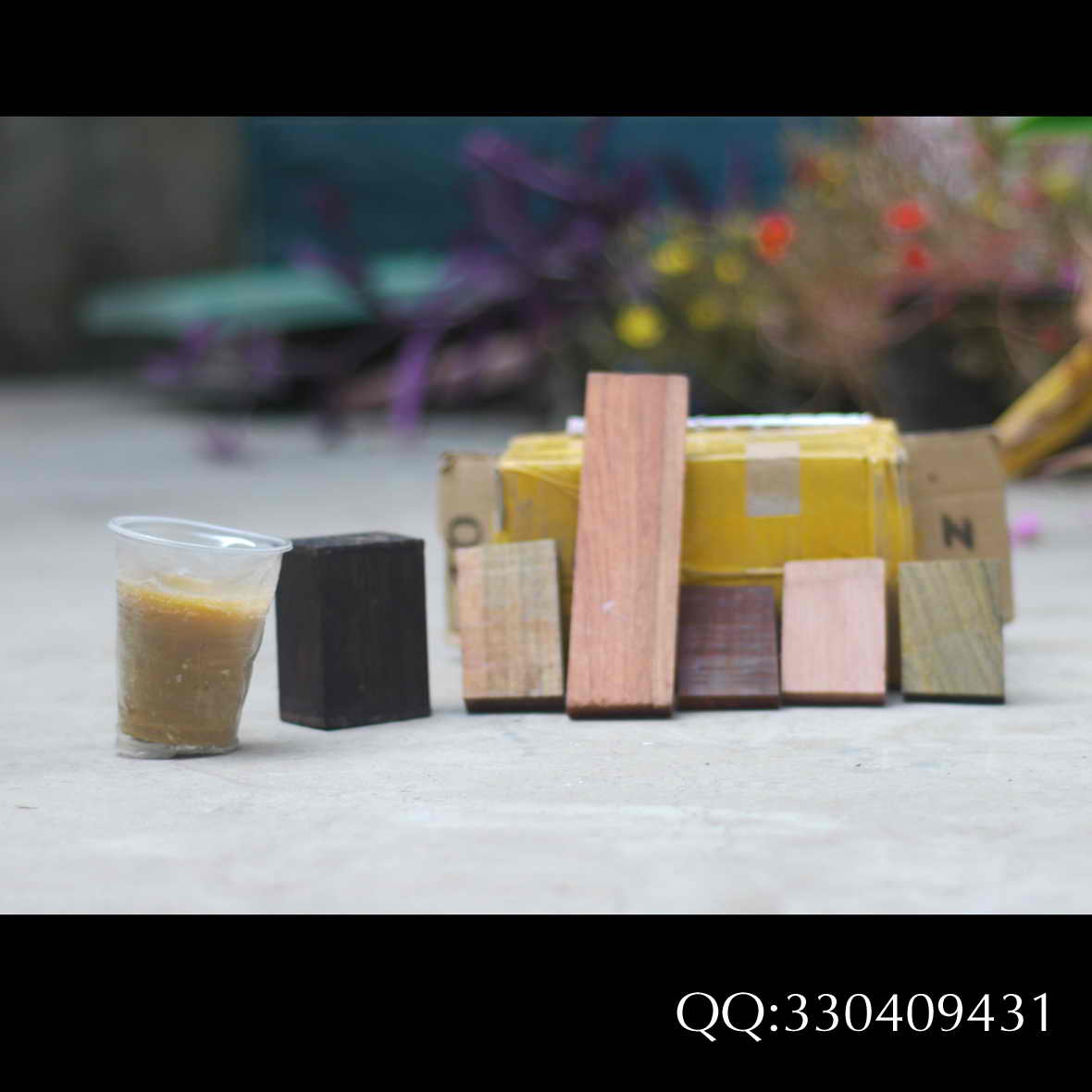 (那块黑黑的就是紫光檀,店家挺会做生意,送了几块其它的木头,绿檀什么的 。杯子里的是蜂蜡)