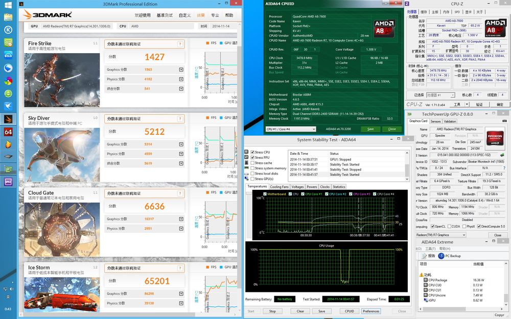 5、win8.1桌面空载:cpu功耗8.5w、gpu7.6w非核心部分7.4w、apu总功耗24w左右、温度31摄氏度 ……
