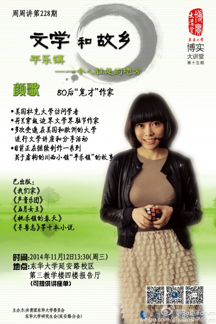 【活动】11月12日下午1:30,东华大学,颜歌讲座
