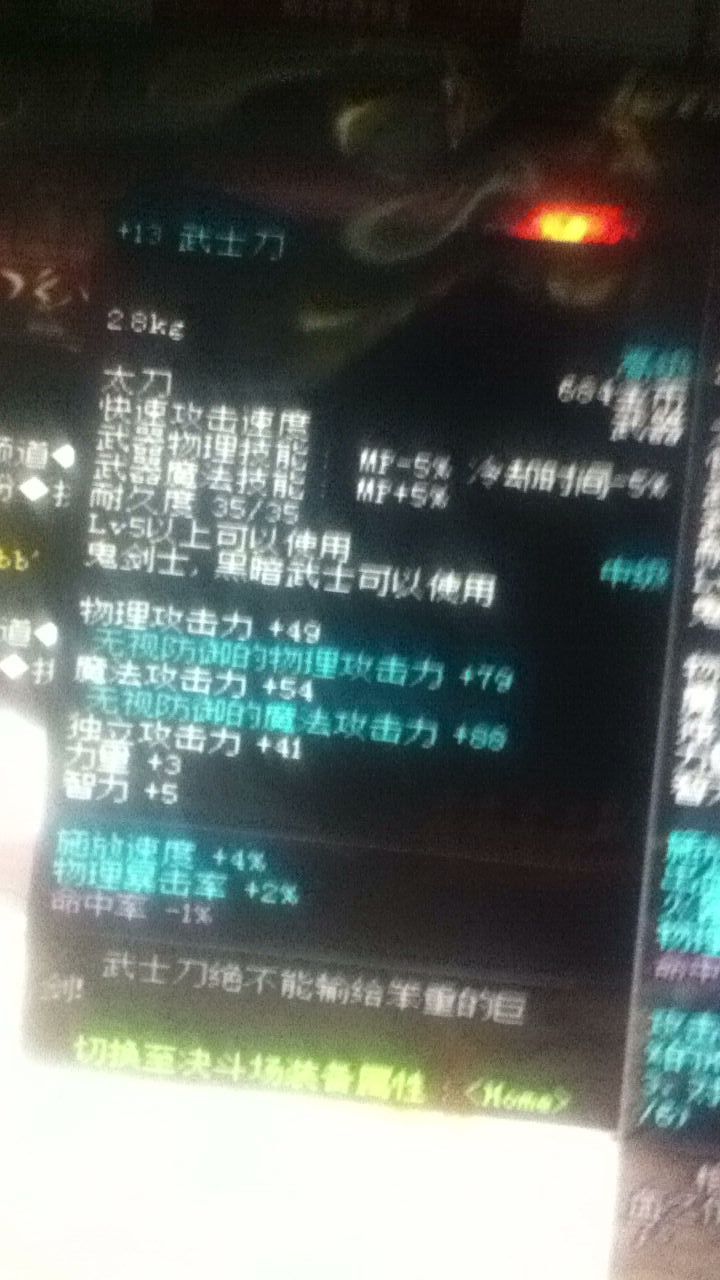 事情是这样的、今天无聊想强化镇魂、已经是11的了、用了14个垫子、成功上11的有8个、然后全碎、镇魂失败、本着在赌一把的心态、又买了张保护卷、然后、买了7个小太刀、只有一个碎了、其他的都是直接仍11、然后……这他妈的什么情况?直接仍也可以?但是我想知道、为毛镇魂就上不去呢?这下好了、连强10的钱都没有了……这个玩意、我们区4000万、不知道能否出手……请看图