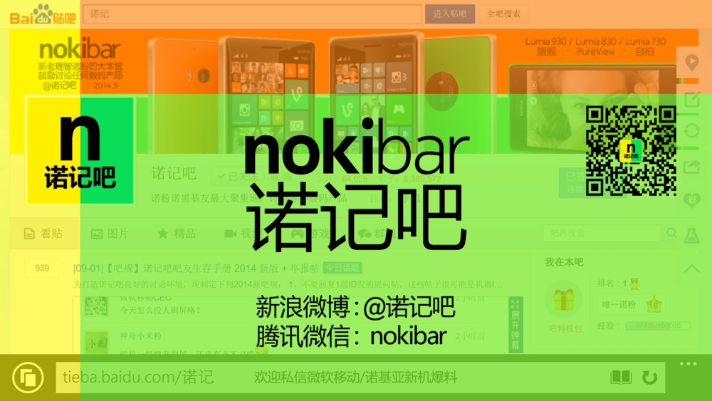 2013年9月3日诺基亚(诺记)宣布出售手机部门给微软,不少诺粉伤心离开了诺记吧,于是号称诺粉诺黑大本营的诺记吧的人气显著下滑,16级会员“唯一诺粉”的阿呆吧主(我)对此十分难过,梦想让诺记吧集中所有活跃在贴吧的理智诺粉及诺黑,继续发展下去。于是我来所有诺基亚机型贴吧发外交帖了,欢迎分散在各机型贴吧的新老诺粉软粉、诺记手机用户在这里活跃的同时,加入并常驻诺记吧,共同讨论诺记手机/平板、日后流着诺记血液的微软手机及其它数码产品。比如入手新机后的第一件事就可以开箱上图分享给吧友,即使以后不用诺基亚了也可以一直活跃在诺记吧。别忘了把诺记吧加入爱贴吧客户端的批量签到列表哦~