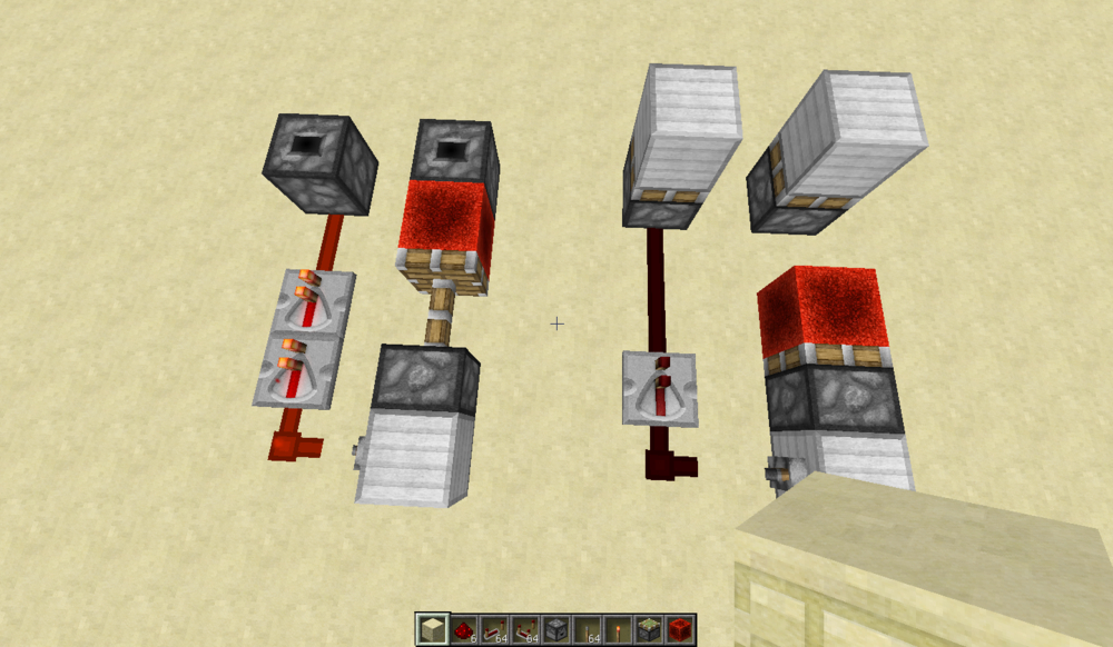 由于在拉杆和活塞之间加了个中继器(延时元件),那么活塞的启动延时被设置成了0t,也就是指活塞需要1t延时来运动(姿势1)。总的来说还要加上延时元件的延时。 上图的总延时(包括中继器)就为:1t+1t=2t
