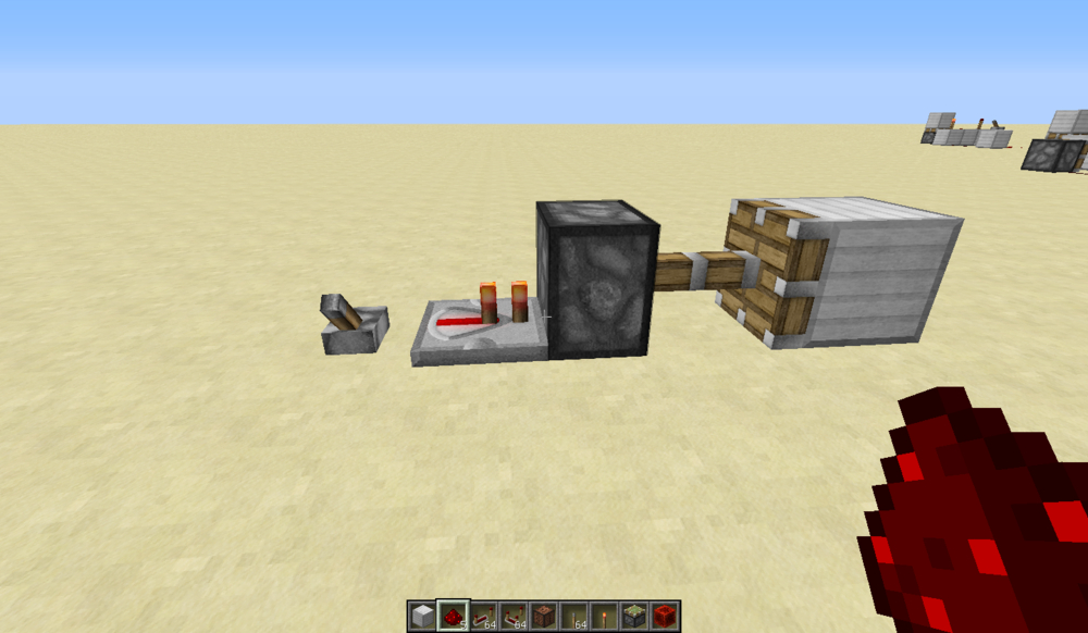 我们在之前的实验中证明了,活塞的延时是1t——2t之间~那么现在下图的拉杆关闭,使输出端的2个活塞失去激活,那么理论上来说,应该是右边的中继器方的活塞先收回,那么我们试试~