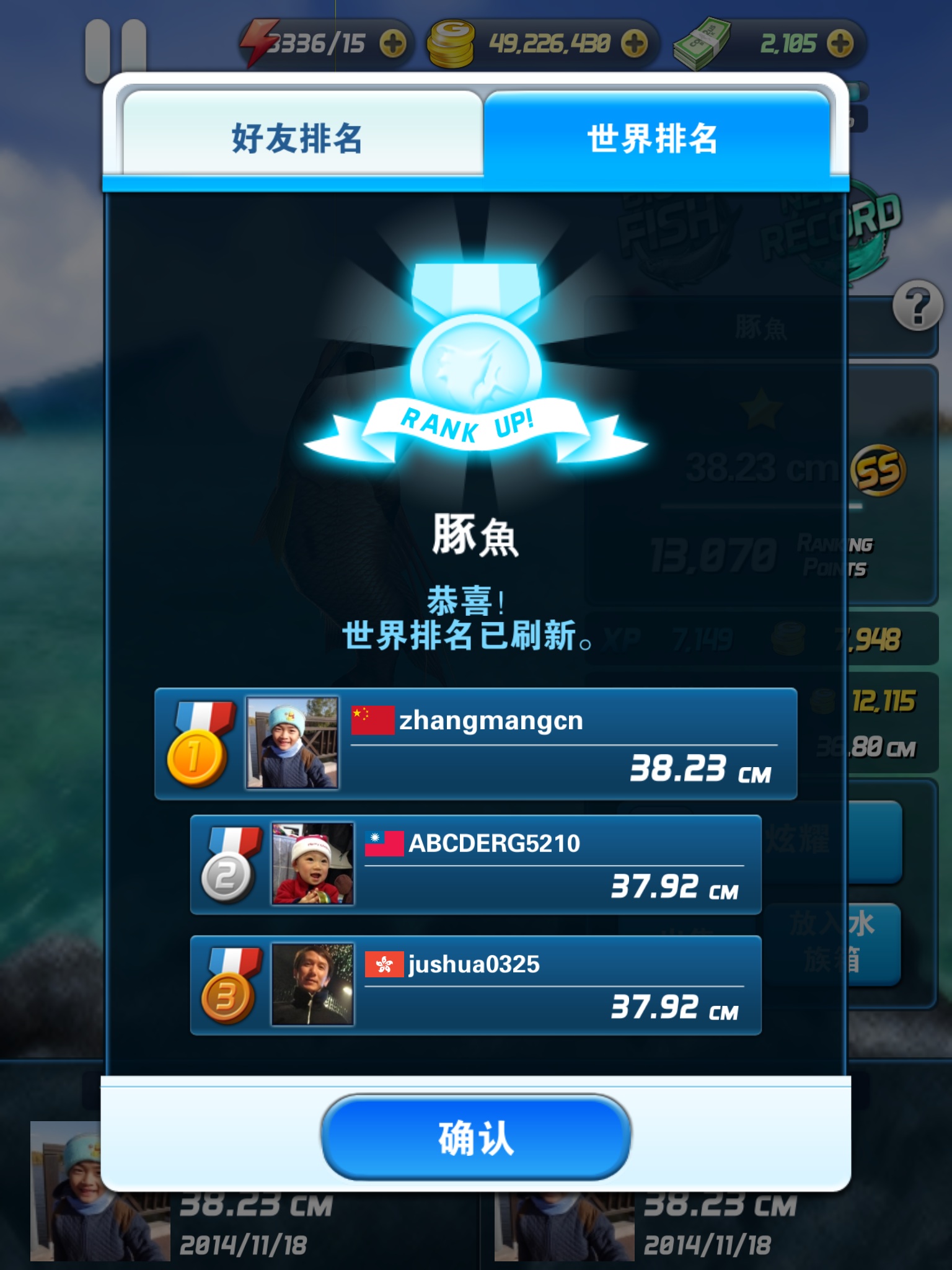 今中午运气完全不行了,双大鱼汽水+高级鱼饵,甩了40多杆一条旗鱼没上,不敢浪费高级汽水了,想用普通汽水再看看,结果刚把高级去掉这货就来了!哎,不过总比不来强,希望能保住前10。