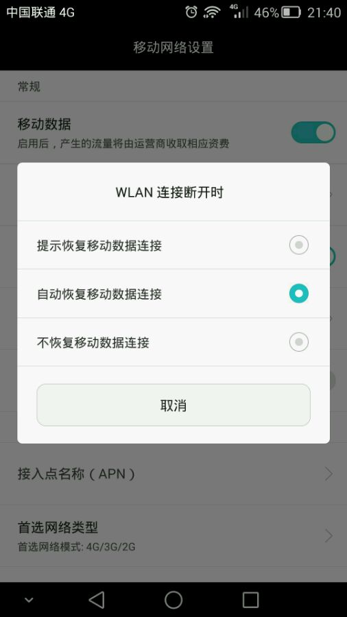 wifi连着,移动数据也打开,但是关掉wifi后,不会自动连移动数据,要关了数据再开才连的上,不是设置问题,求解!!