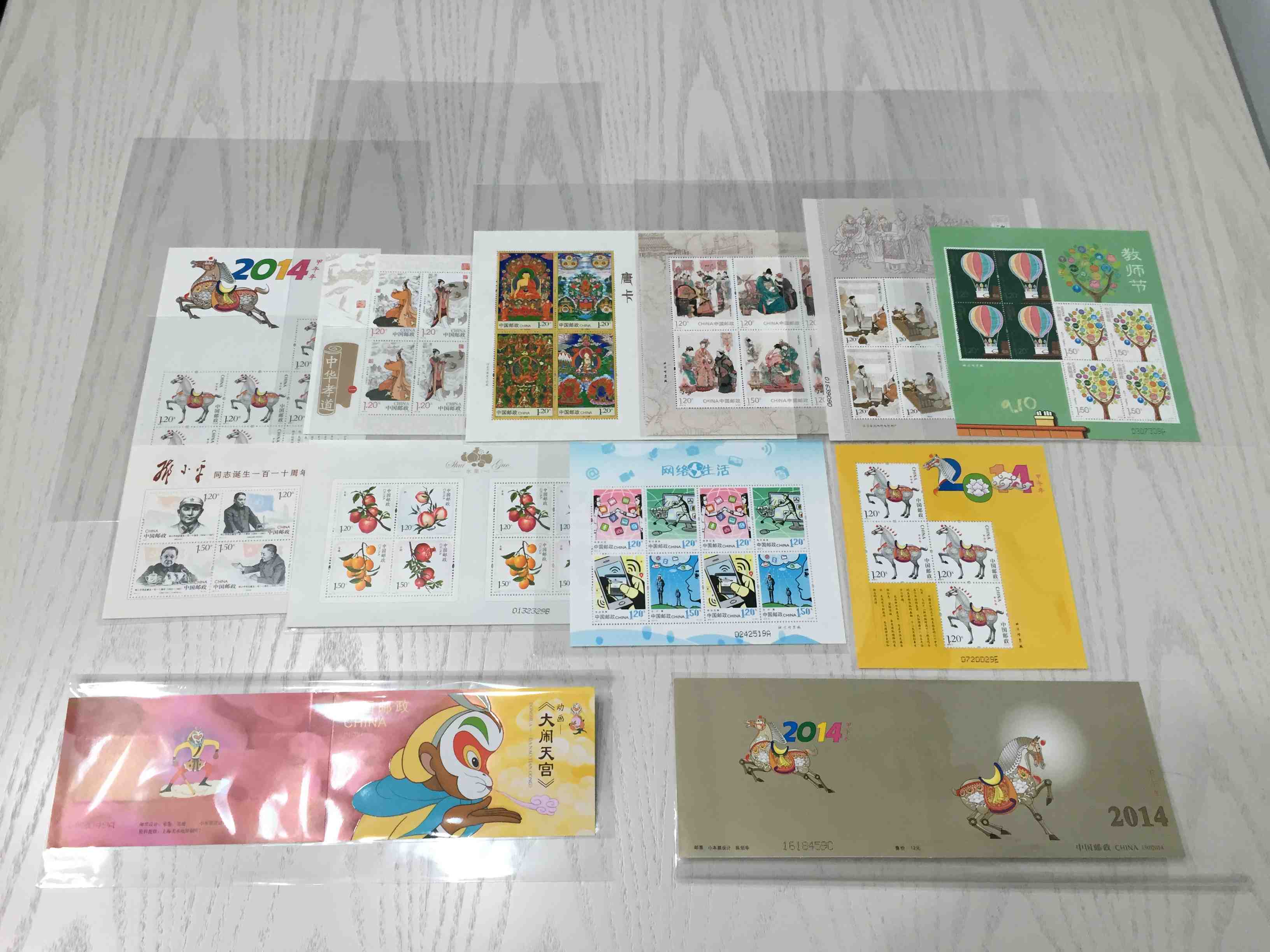 邮票品相:一套包括2014年小版张9全,赠送黄马1张,马小本1本、大闹天宫小本1本,邮局一手货源,原胶全品(天生纸点,背有油墨不做描述)。