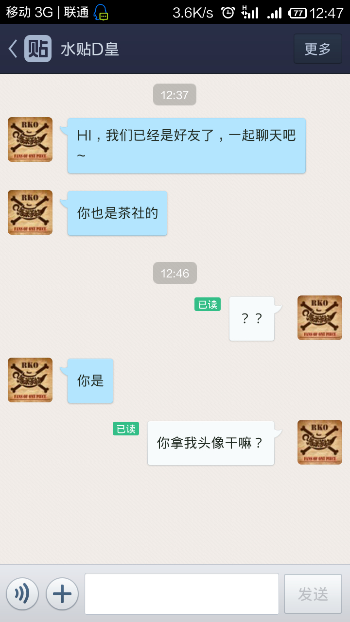 今天早上突然发现贴吧好友里加了一个人,用的是我的头像,赶紧加过去问问,结果发生以下事件,如图: