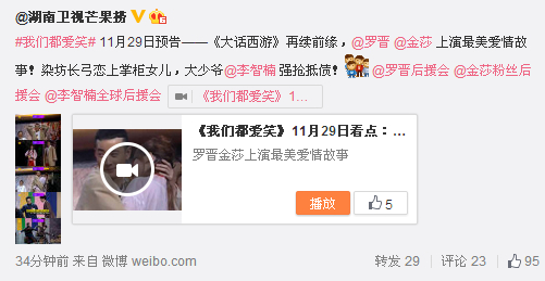 视频标题:《我们都爱笑》11月29日看点:罗晋金莎上演最美爱情故事