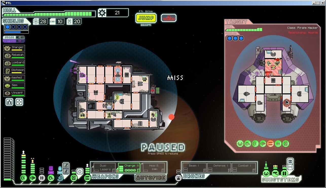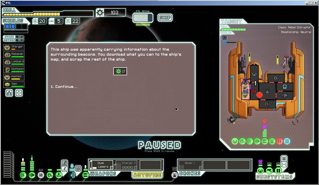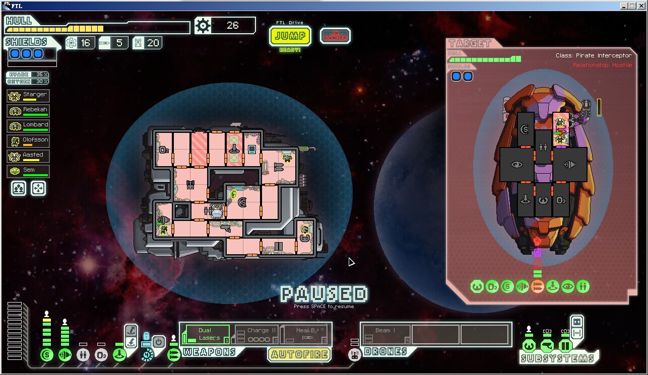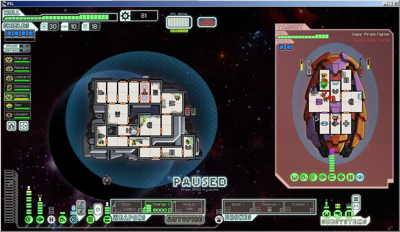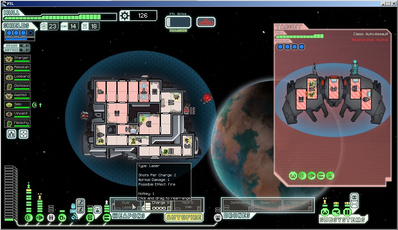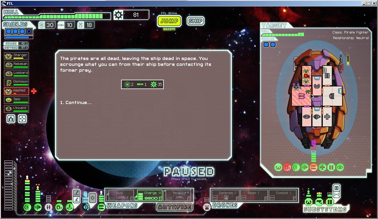 脉冲星,新的自然灾害,特点是每隔很短的一段时间就对你和敌人的船施加数量为3的等离子攻击(无视闪避),护盾优先,如果护盾吃不下就分配到随机的其他系统,再吃不下就再分配,这个自然灾害导致两轮之后基本上不会有正常工作的护盾,三轮之后各类系统随机瘫痪(当然对手也好不到哪去)