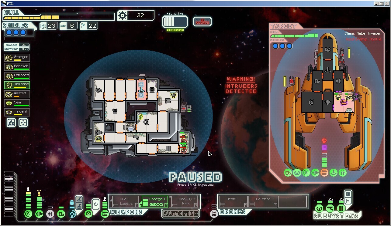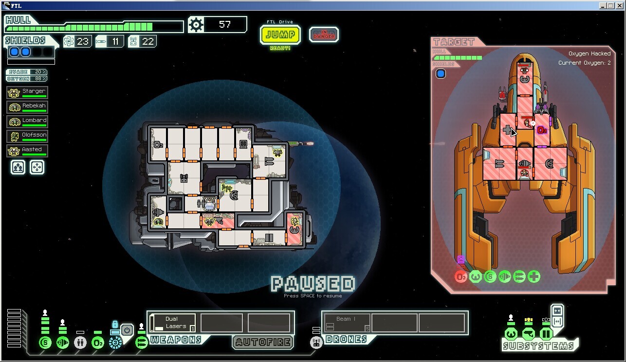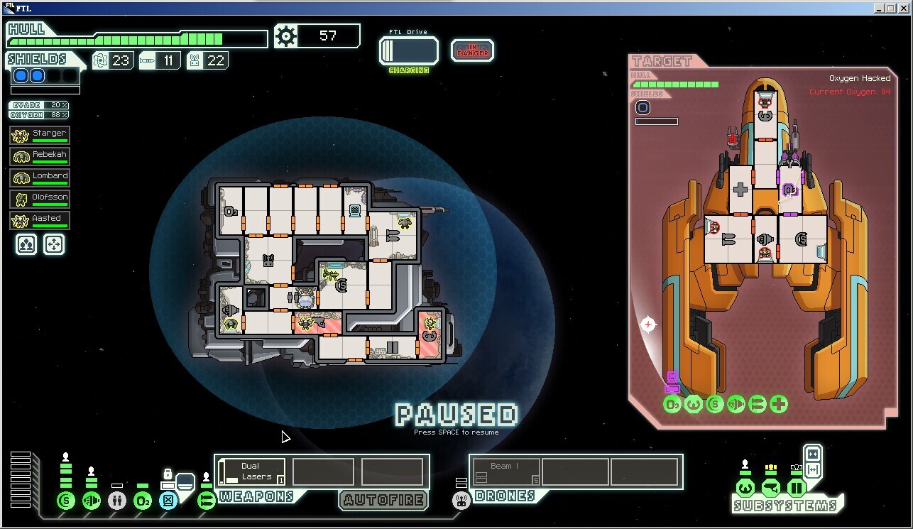 其实第一形态关键就是破坏各种系统,如果有breach或者fire,在这里优势大的吓人,直接给医疗舱来一发火炸弹然后往里送2个岩石,基本上你就等着看戏就可以了,氧气舱同理,来一发breach然后把圣斗士弄进去,等会他们就死剩4个,你就可以悠哉悠哉地杀人切系统了