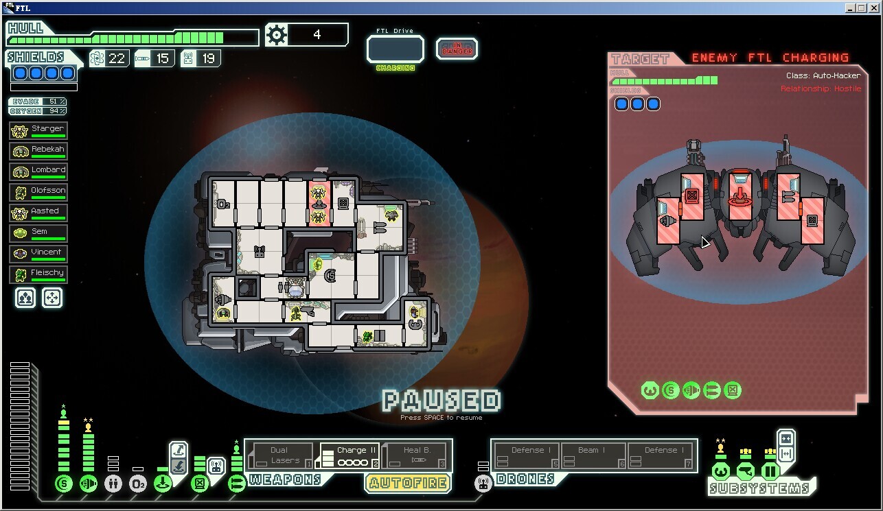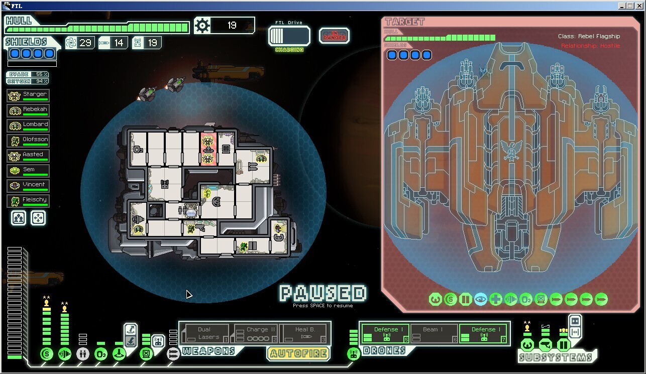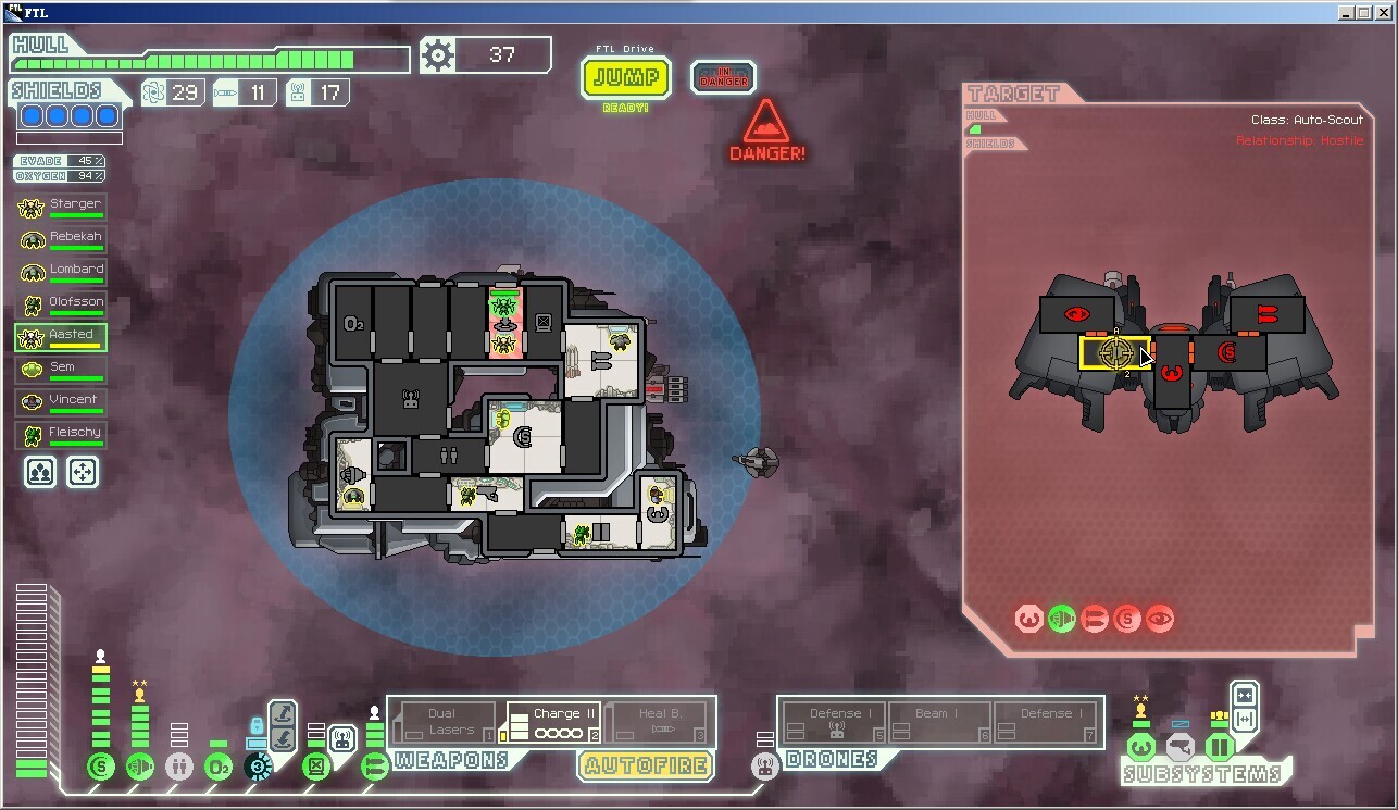 所以应对策略就是放弃无人机系统改用黑客和隐形对付导弹,或者尽快消灭对手。护盾2层左右,引擎4-5级,这与原版不同(原版只需要考虑多一层护盾),也就是说要尽早升级引擎系统,5级就足够不需要继续升级