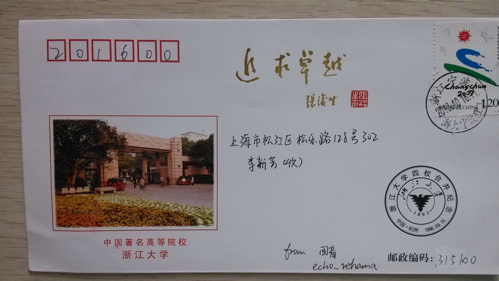 用这种封,我可以给大家办理一套浙江大学的校园邮局戳的和原地及上级邮局的: