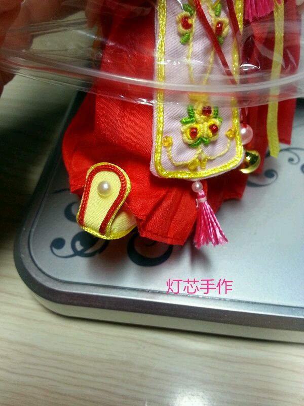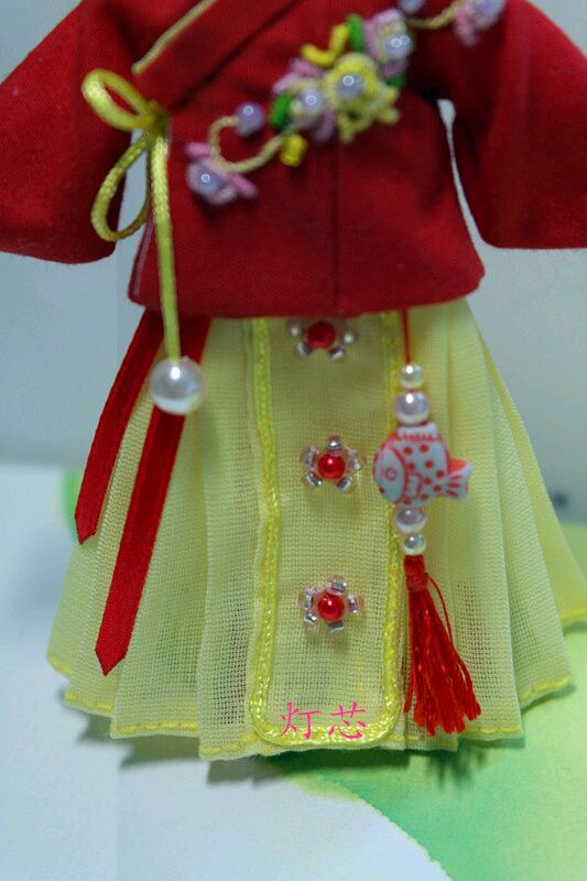 然后,刚完成的对襟襦裙升级版!夏天时候,灯芯做了糖果色的小11衣服,很受娃妈们喜欢。冬天了,用了喜庆的颜色,布料,做工,绣花,细节都升级啦!这次的麻豆是bjd8分小娃。小尺寸太萌,做衣服也方便,还省布料!