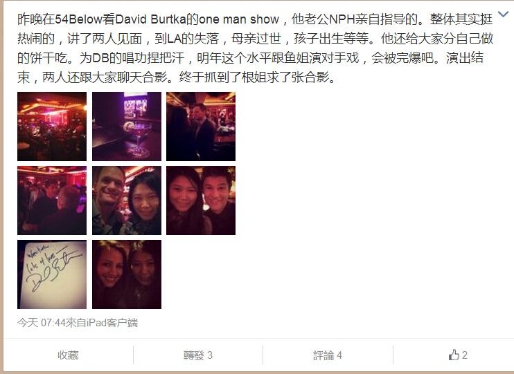 我不知道演出后他们会和大家聊天,演出完我就走了,有点后悔,不过能见到David我就很开心了,我不同意她对David唱功的看法,不要批评我家的David