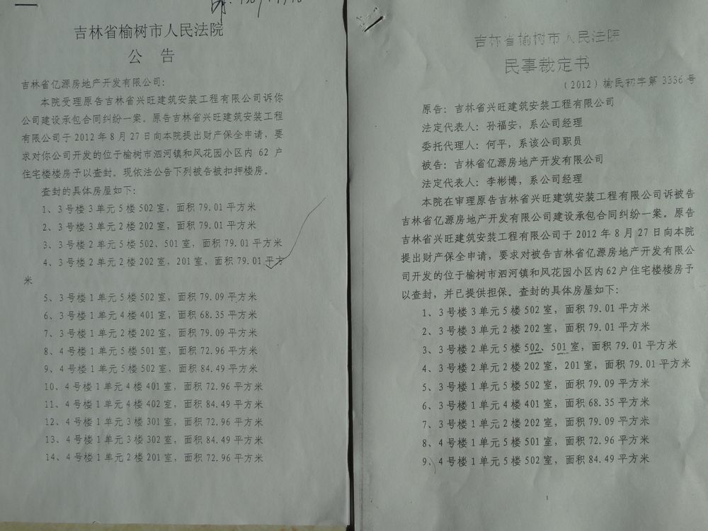 这是法院扣押文书送达,和贴在售楼处墙上的公告及法院送达给被告售楼处的照片