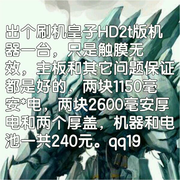 出个刷机皇子HD2t版机器一台,只是触膜无效,主板和其它问题保证都是好的,两块1150毫安*电,两块2600毫安厚电和两个厚盖,机器和电池一共240元。qq1947350525